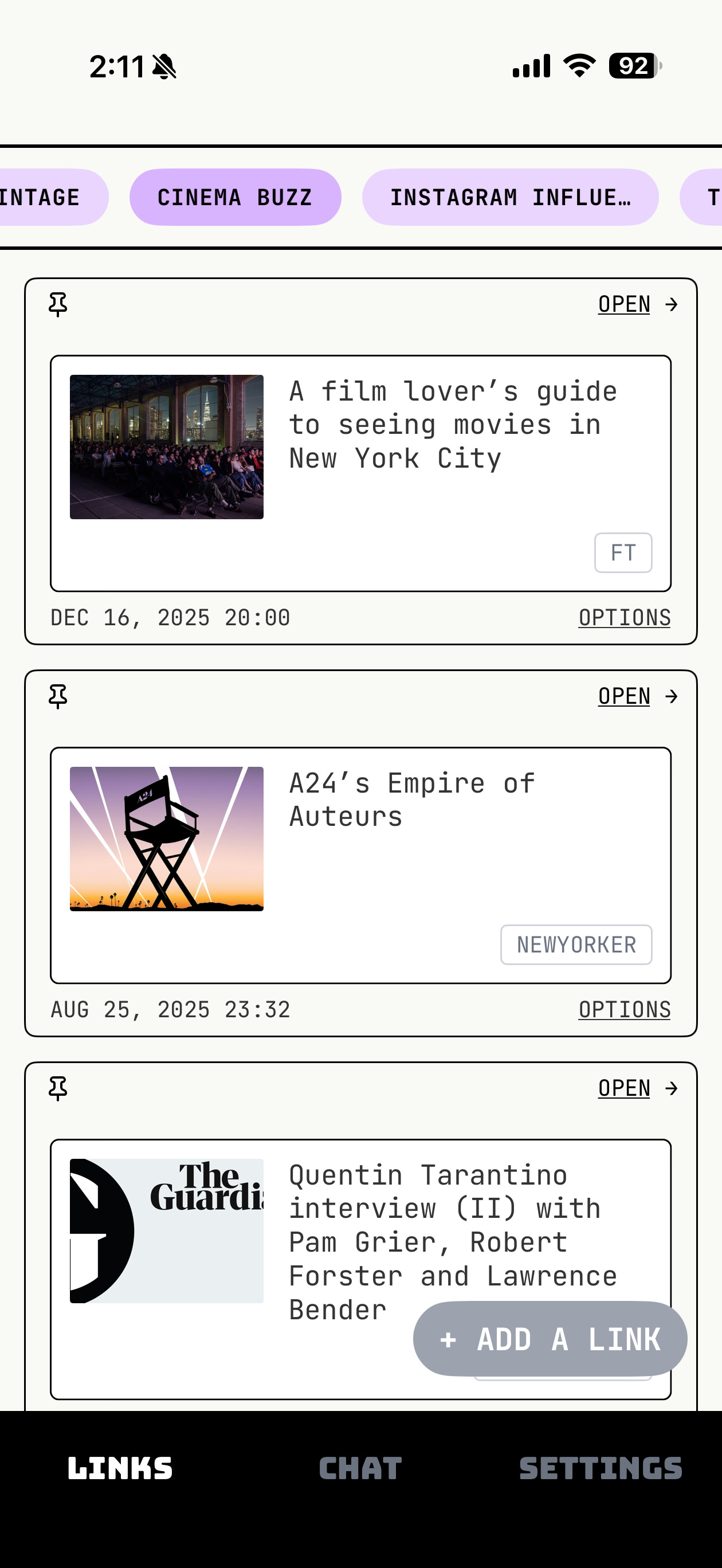 Filter bar. This is another thing we’ve been desperate to show you. As you may have seen, your Links feed now has a series of filters at the top that scroll in a ticker. The filters are based on your last 100 or so saved links and dynamically regenerate every so often. Here’s one of mine from this week.